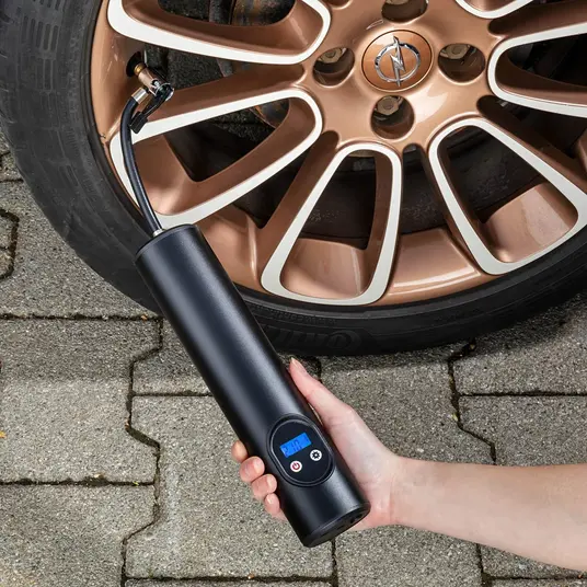 Tato přenosná bateriová pumpička má dobíjecí Li-Ion baterii, a díky tomu jí lze bezdrátově používat kdekoli na doplnění vzduchu.