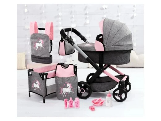Úžasný kočárek Bayer Design® + nezbytné potřeby pro spokojenou holčičku i její panenku. Vše v designu jednorožec. Hluboký kočárek lze jednoduše nastavit na sportovní kočárek.